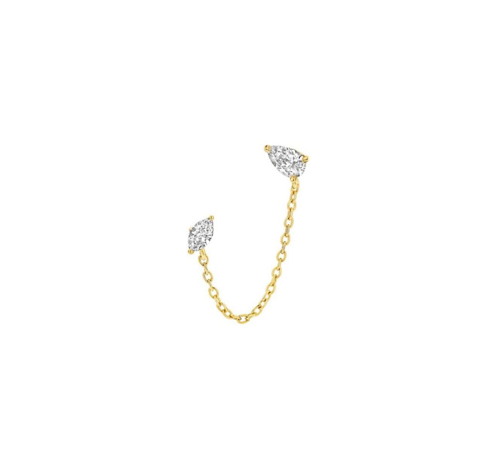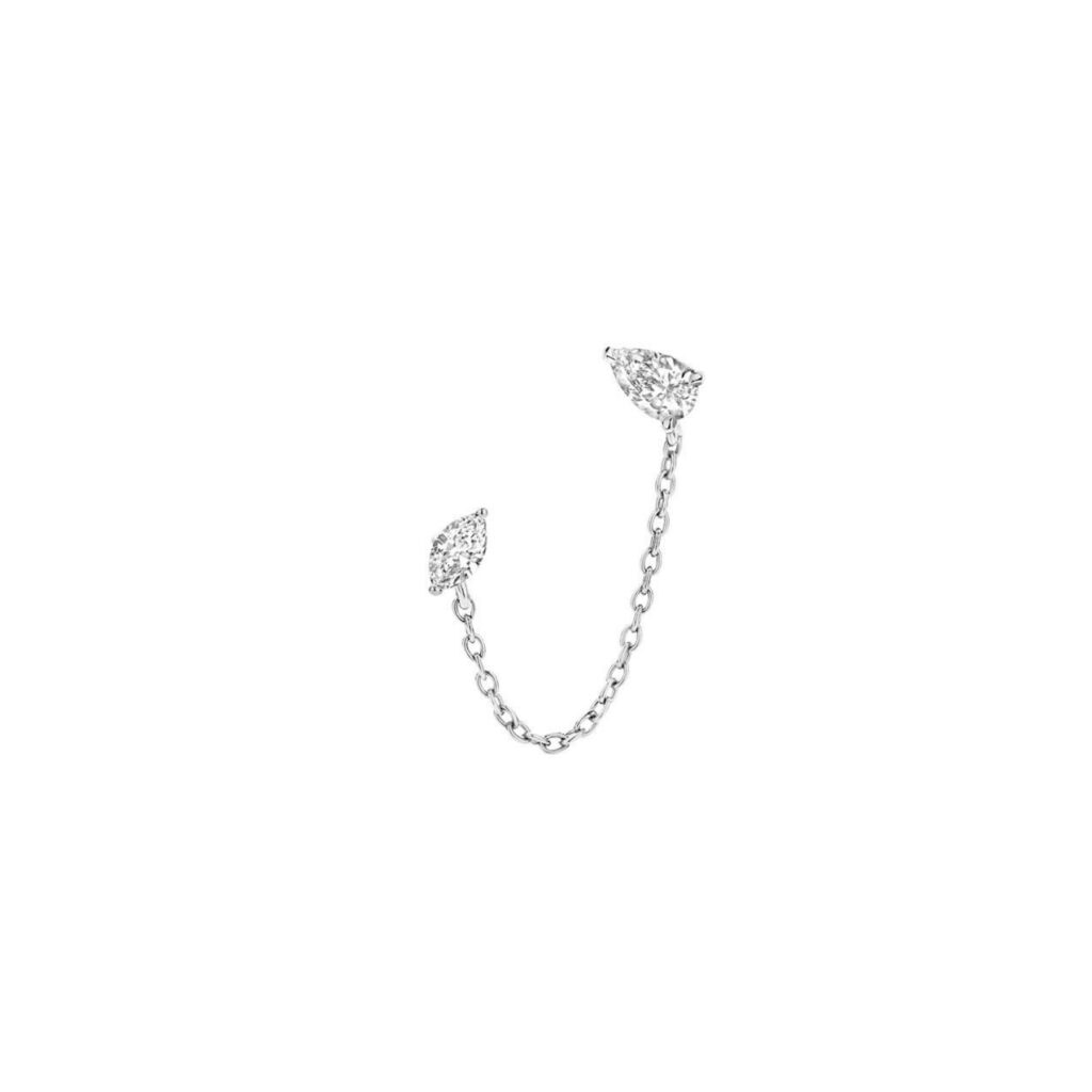 Cette chaîne d’oreille en or unit un diamant taille poire et un diamant taille marquise, délicatement reliés par une fine chaîne d’or. Leur éclat naturel crée une ligne de lumière aérienne, à la fois moderne et délicate, sublimant le port de tête avec une élégance discrète et singulière.